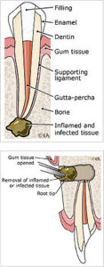 Process: The endodontist opens the gum tissue to see the underlying bone and remove any inflamed or infected tissue. The very end of the root is also removed. A small filling seals the end of the root canal. A few stitches are placed in the gum to close the tissue.